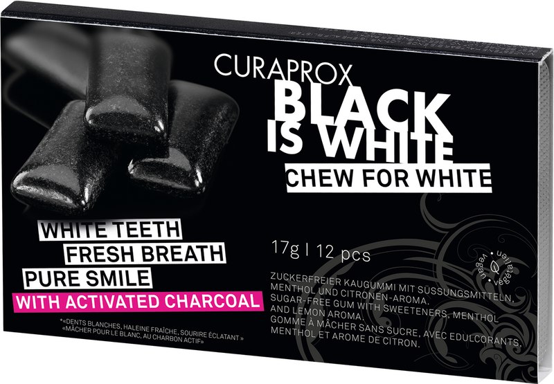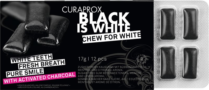 Mundgesundheit durch Kauen: Der «Black Is White»-Chewing Gum macht Zähne weiss dank Aktivkohle. Weitere wertvolle Inhaltsstoffe unterstützen die Mundhygiene und schützen vor Karies. Kräftig Lifestyle also, krass mundgesund, typisch Curaprox.