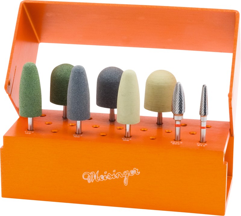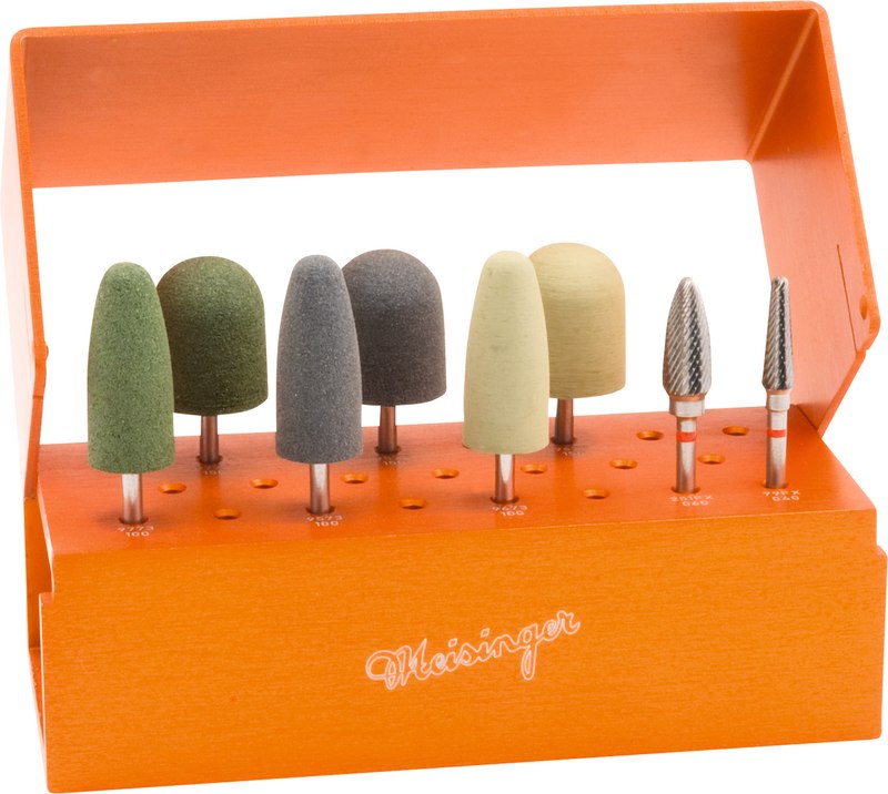 Der Prothesenkorrektursatz bietet ein umfassendes Instrumentarium für die einfache und schnelle Durchführung verschiedenster Korrekturen am Kunststoff in der Praxis. Die innovative Verzahnungsgeometrie der im Sortiment enthaltenen Hart metallfräser sichert dabei bereits beim Einsatz dieser Instrumente die Erzielung ungewöhnlich glatter Oberflächen. Die verschiedenen Kunststoffpolierer sind das Ergebnis langjähriger Entwicklungen und zeichnen sich durch außergewöhnlich hohe Leistungsfähigkeit und Haltbarkeit aus.