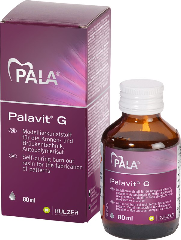 Selbsthärtender Zweikomponenten-Modellierkunststoff für die Gießtechnik. Geeignet für die rationelle Herstellung von Gussmodellen aller Art. Moderne Modellierkunststoffe erhalten die Form Ihrer Modellation zuverlässiger als Wachs. Palavit® G ist auch bei dünner Randgestaltung formfest, unempfindlich beim Bearbeiten und härtet schnell und sicher aus. Erhalten Sie passgenaue Kronen- und Brückengerüste mit Palavit® G, unserem Modellierwerkstoff für die Gießtechnik. Der selbsthärtende Zweikomponenten-Modellierkunstoff besteht aus Pulver und Flüssigkeit.