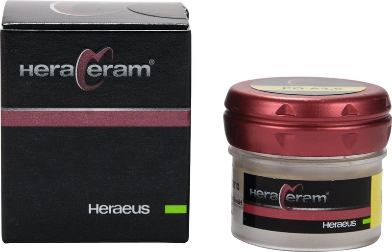 HeraCeram® ist die hochschmelzende Verblendkeramik für Aufbrennlegierungen in einem WAK-Bereich von 13,5 – 14,9 μm/mK. Aufgrund der niedrigen Brenntemperaturen von maximal 880 C können alle Legierungen in diesem WAK-Bereich sicher verarbeitet werden. Zur ästhetischen Gestaltung bietet HeraCeram® neben optimal auf einander abgestimmte Opaker, Dentin- und Schneidemassen ein umfassendes Sortiment an Individualmassen. Sie erzielen auch bei geringen Schichtstärken zuverlässige Farbergebnisse. Die Standfestigkeit der Massen und der geringe Brennschrumpf sorgen für eine hohe Formstabilität der Verblendung. Mit einer dichten, extrem glatten Oberfläche schützt HeraCeram® den Antagonisten und sorgt für hohe Plaqueresistenz und Gingivafreundlichkeit.