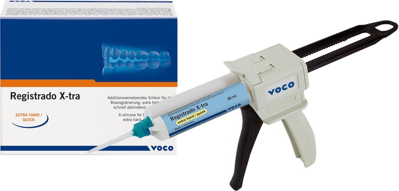 Extra hartes, schnell abbindendes, additionsvernetzendes Silikon zur Bissregistrierung im Kartuschensystem. Besonders vorteilhaft ist auch die temperaturgesteuerte Abbindezeit von Registrado X-tra, die Mundverweildauer beträgt nur 40 Sekunden.