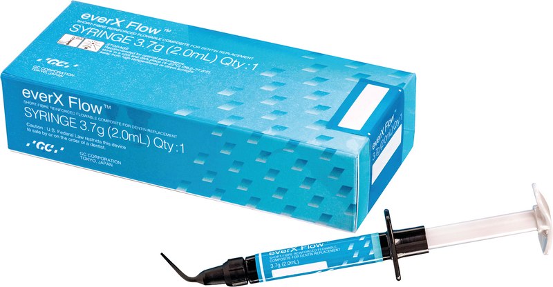 Glasfaserverstärktes, fließfähiges Composite für den Dentinersatz. GC everX Flow™ weist dank der hohen Anzahl an mit der Kunststoffmatrix verbundenen Glasfasern eine exzellente Bruchfestigkeit auf, die der von Dentin sehr ähnlich ist. Dieser hochstabile Dentinersatz dient der effizienten Verstärkung großer Seitenzahnrestaurationen in Kombination mit einem konventionellen Composite als Schmelzschicht. Das glasfaserverstärktes, fließfähige Composite ist geeignet für alle direkten Composite-Restaurationen, auch große Seitenzahn- Kavitäten, tiefe Kavitäten und endodontisch behandelte Zähne, sowie zusätzlich auch für den Stumpfaufbau. GC everX Flow™ bietet ein kontrolliertes Fließverhalten für eine einfache Platzierung in den oberen Molaren und ohne Einsacken des Materials. Die ergonomische Spritzenform ermöglicht eine komfortable und punktgenaue Applikation.