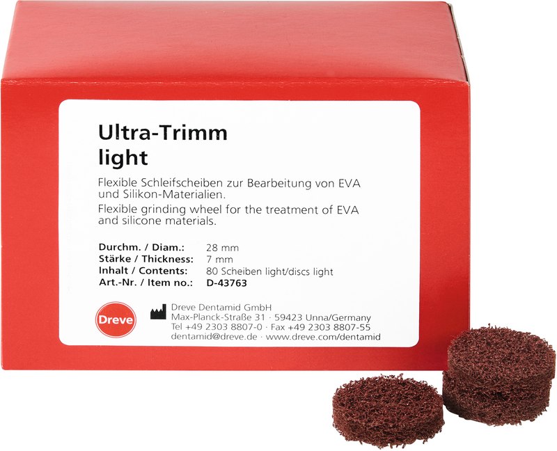 Flexible Schleifscheiben für das grobe bis feine Bearbeiten von EVA-Tiefziehplatten für Sportmundschutz (z. B. Drufosoft®), weichbleibendem Unterfütterungssilikon (z. B. MegaBase®), Positioner-Silikon (z. B. Odontosil), sowie für harte und hart/weiche Tiefziehfolien bei maximal 15.000 Umdrehungen / Minute.