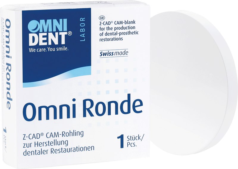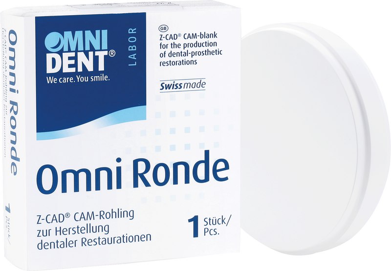Die Omni Ronde One4All ist ein biokompatibles Hochleistungszirkon und entspricht der Klasse 5 nach ISO 6872:2019. Eine charakteristische Festigkeit von über 1.000 MPa (biaxiale Messung). Ein Transluzenzwert von 45 %. Erhältlich in den 16 Vita classical Farben A1 – D4. Die Ronden haben einen Durchmesser von 98,5 mm. Die flexible Lösung im Laboralltag. Für sämtliche Arbeiten im Front- und Seitenzahnbereich. Kronen, Teilkronen, Veneers, Inlays, Onlays und Brücken sind bei diesem Material indiziert. Stegkonstrukte, Suprastrukturen und Hybridprothesen, die Auswahl ist enorm, um es in einem Prozess zu fräsen. Geschraubt oder zementiert, Ihre Strukturen lassen nichts zu wünschen übrig. Das fertiggestellte Material kann monolithisch oder verblendet im Mund eingesetzt werden. Mit einer entsprechenden Zirkon-Verblendkeramik ist eine noch individuellere Gestaltung erfüllbar. Alternativ kann auch mit Zirkon-Presskeramik überpresst werden.