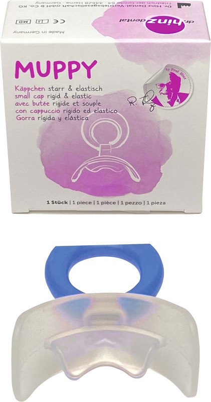 Lutschgewohnheiten führen unter anderem zur Protrusion der Oberkieferfrontzähne und können eine bereits bestehende Rücklage des Unterkiefers verstärken. Hier ist das MUPPY® Käppchen indiziert. Dieses Einbiss-Käppchen verhindert das Abkippen des MUPPY®. Der Unterkiefer wird gleichzeitig nach vorne geführt. Das elastische MUPPY® aus transparentem Silikonmaterial wird außerdem auch zu Beginn des Zahnwechsels bei einem Tiefbiss mit traumatischem Einbiss eingesetzt.