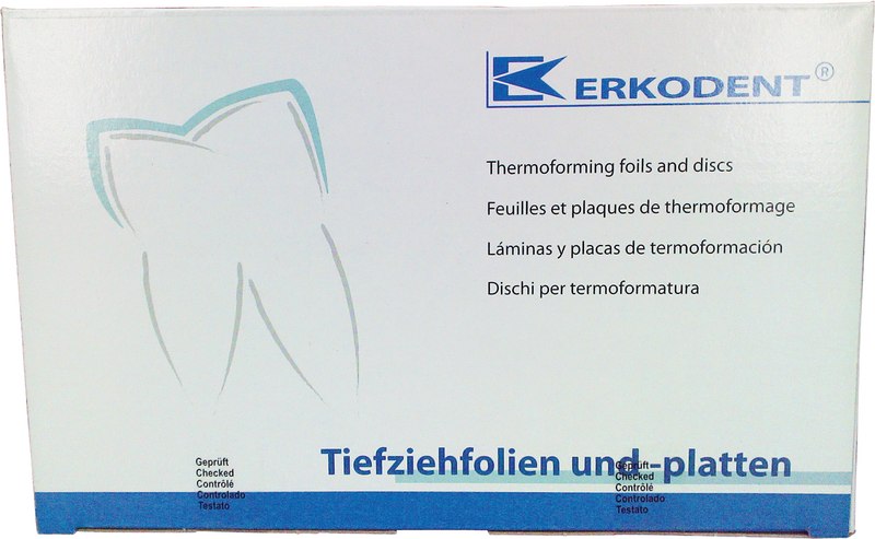 Erkodur-A1 in heller Zahnfarbe. Wird für Provisorien (Stärke 0,6 mm), als Stabilisierungsschiene (1,0 mm) und als kosmetische Schienen (1,0 und 2,0 mm) zum Aufstecken auf die eigene, kosmetisch...