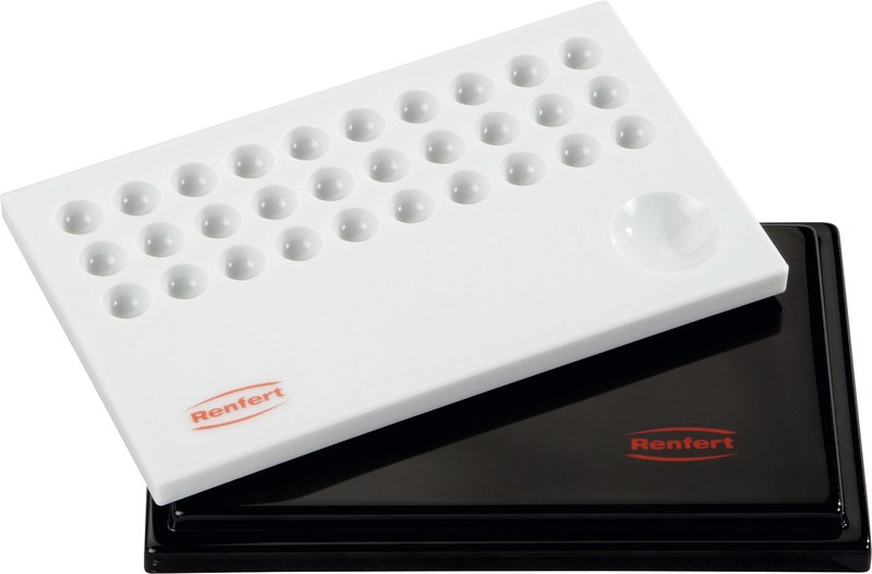 Keramikanmischplatte für Malfarben. 30 kleine Mulden für Malfarben. 1 große Mulde für Glasurmasse. Mit schwarzem Deckel für lichthärtende Malfarben geeignet.