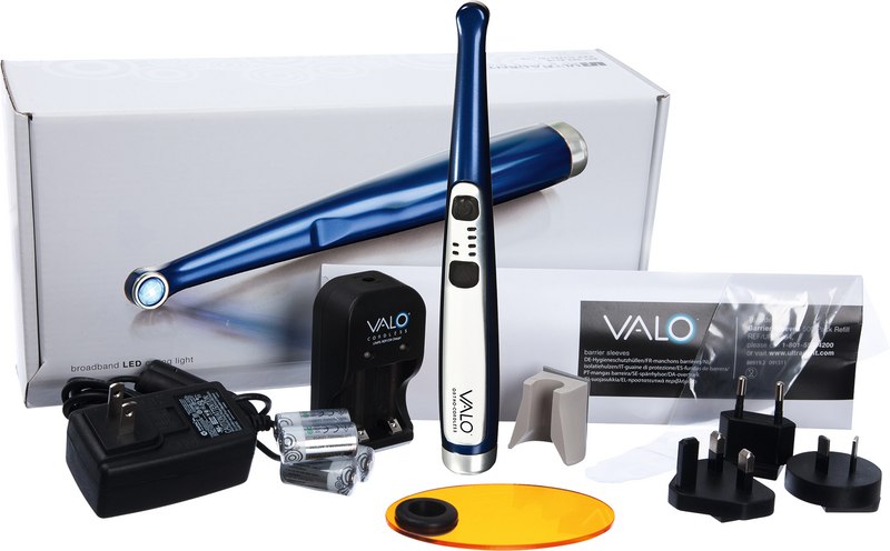 Kit VALO Ortho Cordless LED-Polymerisationsleuchte, Batterieladegerät, Netzteil für Ladegerät, Handstückhalter, VALO Cordless Light Shield, Black Light lens, Musterpackung Hygieneschutzhüllen, 4 x aufladbare Batterien