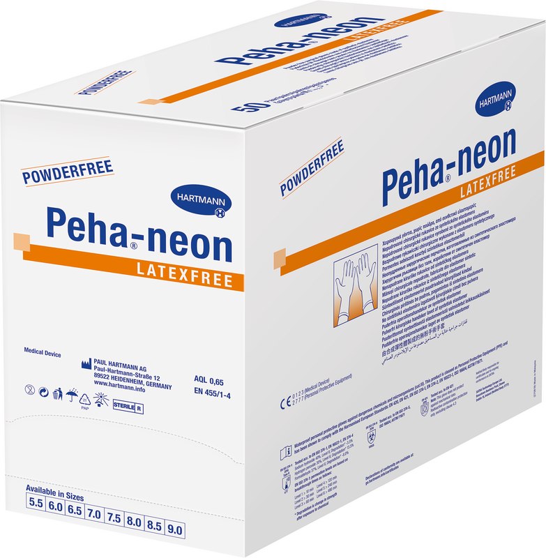 Latex- und puderfreie Einmal-OP-Handschuhe aus synthetischem Polychloroprene, durch Polymer-Innenbeschichtung leicht anzuziehen, mit spezieller texturierter Oberfläche für gute Griffigkeit, sehr gutes Tastempfinden, hochelastisch und reißfest, ermüdungsfreier Sitz durch vollanatomische Passform, braun eingefärbt zur Vermeidung von Lichtreflexen. Geeignet für Latexallergiker. Peha-neon® latexfree ist ein Medizinprodukt nach EN 455 und Persönliche Schutzausrüstung nach EN 374. Geeignet für den Einsatz mit Zytostatika und Chemikalien. Limitierter Schutz gegen Knochenzement. Er erreicht ein AQL Niveau von 0,65.