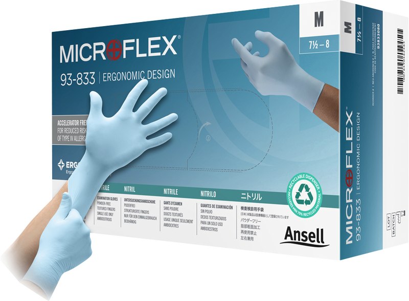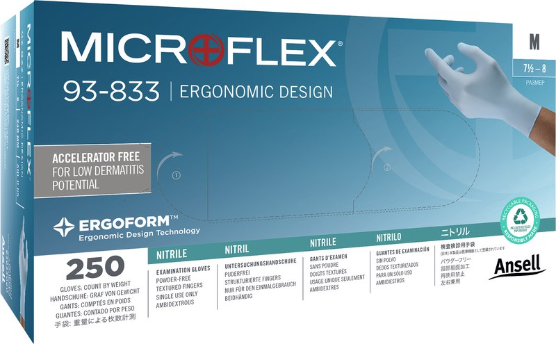 Entwickelt für einen geringeren muskulären Kraftaufwand und größere Produktivität des Trägers durch eine reduzierte Handermüdung. Als erster von U.S. Ergonomics, einem in der Industrie führenden Unternehmen für ergonomische Standards, mit einem Ergonomie-Zertifikat ausgezeichneter Untersuchungshandschuh unterstützt der Microflex® 93-833 den Schutz des Trägers vor einem Karpaltunnelsyndrom und minimiert die Risikofaktoren für ergonomisch bedingte Verletzungen am Arbeitsplatz