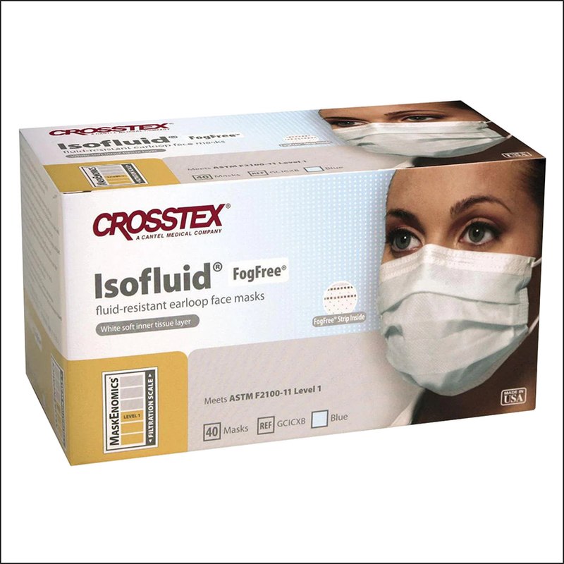 Crosstex™ Isofluid™ FogFree™ mit Gummi-Ohrschlaufen. ASTM LEVEL 1: Ideal für Verfahren, bei denen geringe Mengen an Flüssigkeit, Spray und/oder Aerosolen entstehen.