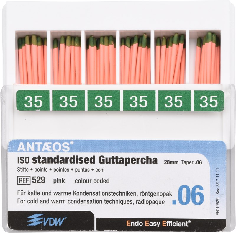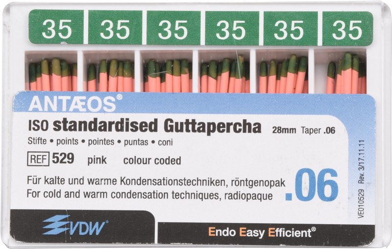 - Guttapercha Taper.02 ISO standardisiert. Guttapercha Taper.04 und .06 zur schnellen Obturation "Crown Down" aufbereiteter Kanäle
