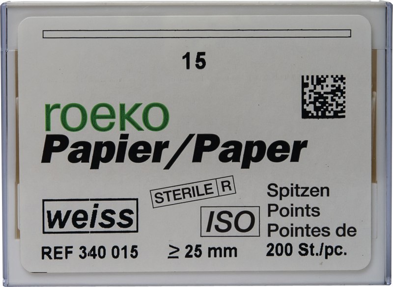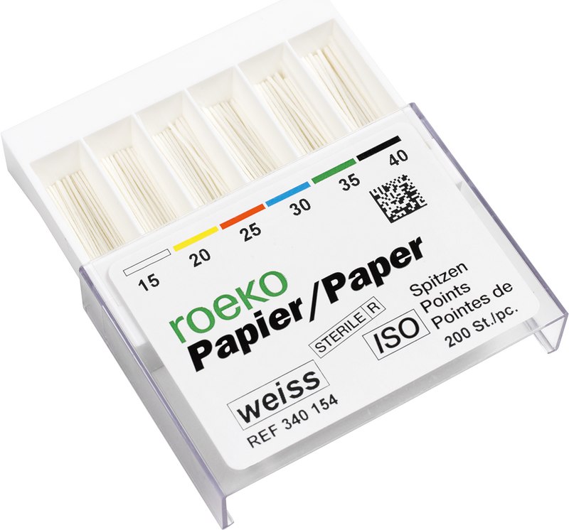 Roeko Papierspitzen werden aus extrem saugstarkem Papier ohne chemische Zusätze und Bindemittel hergestellt. Sie verbinden optimale Festigkeit mit hoher, gleichbleibender Flexibilität und absoluter Maßhaltigkeit. Zur optimalen Trocknung des Wurzelkanals nach exakter Vorbereitung mit genormten ISO-Wurzelkanalinstrumenten. Die weiße Spitze erleichtert die Kontrolle der Wurzelkanalreinigung. Für eine wirtschaftliche, sichere und zeitsparende Behandlung. Die weissen Spitzen ermöglichen die Kontrolle der Wurzelkanalreinigung.