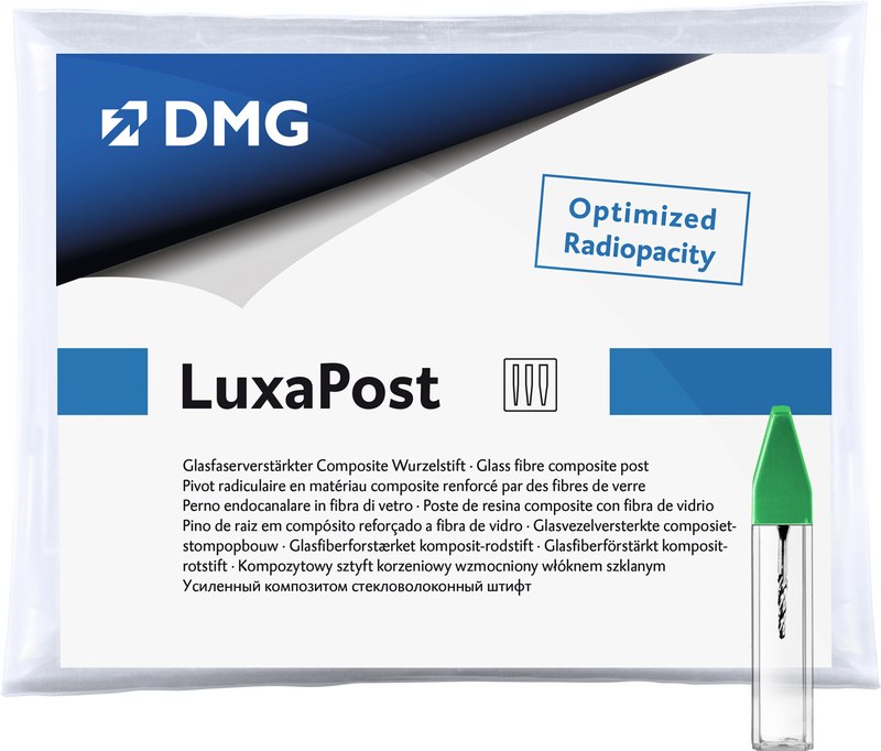 Glasfaserverstärkter, vorsilanisierter Composite-Wurzelstift mit dentinähnlichem Biegemodul; röntgenopak; substanzschonende konische Form; kein Vorbohren notwendig. Perfekt abgestimmt auf LuxaCore Z-Dual und LuxaBond-Total Etch.