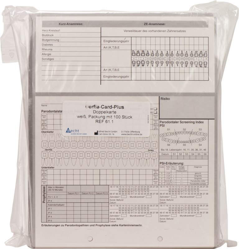 Derfla-Card-Plus ist ideal in der Handhabung, bietet noch mehr Möglichkeiten – und alle wichtigen Prophylaxeleistungen werden künftig umfassend dokumentiert: Die Derfla-Card-Plus unterstützt Sie optimal bei Ihrer täglichen Arbeit. Auf der Karte können Sie sowohl den Parodontalen Screening Index (PSI) notieren als auch die Prophylaxeleistungen für Kinder und Jugendliche tabellarisch erfassen. Format und Alphabetleiste der Derfla-Card-Plus sind mit allen gängigen Karteisystemen kompatibel. Die Darstellung des Parodontalstatus und der Behandlungsplan wurden den Formularen der gesetzlichen Krankenversorgung (GKV) angeglichen. Zudem enthält die Karte eine Rubrik für vorhandenen wie geplanten Zahnersatz und einen übersichtlichen Buchführungsteil auf der Rückseite. Dokumente und Röntgenfilme lassen sich in der mitgelieferten Sichthülle sicher aufbewahren.