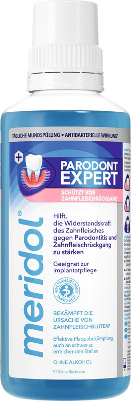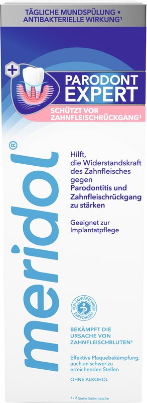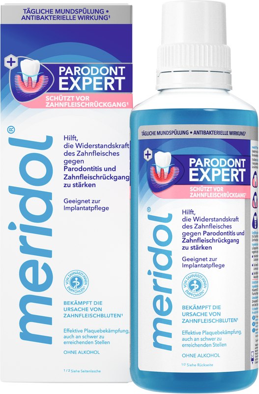 meridol® PARODONT EXPERT Mundspülung bekämpft die Ursache von Zahnfleischbluten und -entzündungen* und hilft die Widerstandskraft des Zahnfleischs gegen die Ursache von Zahnfleischbluten,...