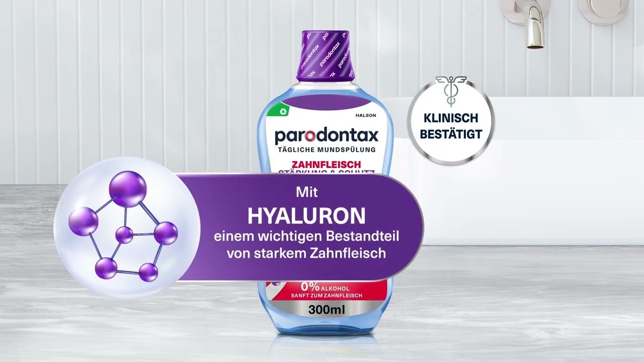 Die Mundspülung parodontax Zahnfleisch Stärkung & Schutz mit kühlem Minzgeschmack hilft bei 2x täglicher Anwendung, den Zahnfleischrand zu stärken, um das Zahnfleisch langfristig zu schützen. Diese innovative parodontax-Formulierung bietet bei 2x täglicher Anwendung klinisch nachgewiesenen Schutz vor Zahnfleischproblemen. Gesundes Zahnfleisch bildet einen straffen Zahnfleischrand und umschließt die Zähne eng. Wenn sich Plaquebakterien am Zahnfleischrand ansammeln, kann der Abschluss gelockert werden und Zahnfleischprobleme können entstehen. Die Mundspülung parodontax Zahnfleisch Stärkung & Schutz mit kühlem Minzgeschmack bekämpft Plaquebakterien und reduziert Plaquebildung am Zahnfleischrand für einen starken und straffen Übergang zwischen Zahnfleisch und Zähnen.* Außerdem schützt die Mundspülung durch Reduzierung von Plaquebildung um das Zahnfleisch gesund zu halten - jeden Tag!* Die Mundspülung parodontax Zahnfleisch Stärkung & Schutz mit kühlem Minzgeschmack enthält Hyaluron, einen wichtigen Bestandteil von starkem Zahnfleisch. Diese Mundspülung enthält Pfefferminze für ein intensives Frischegefühl. Sie enthält außerdem antibakterielle Inhaltsstoffe, um Mundgeruch zu bekämpfen. Die Flasche ist recyclingfähig** und aus 50% recyceltem Plastik.*** Die Mundspülung parodontax Zahnfleisch Stärkung & Schutz kühle Minze: Langfristiger Zahnfleisch-Schutz* für starkes Zahnfleisch und starke Zähne.
