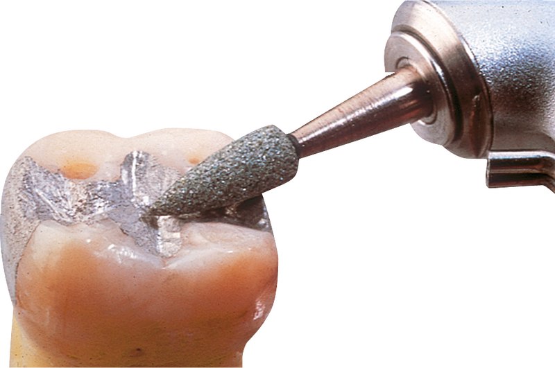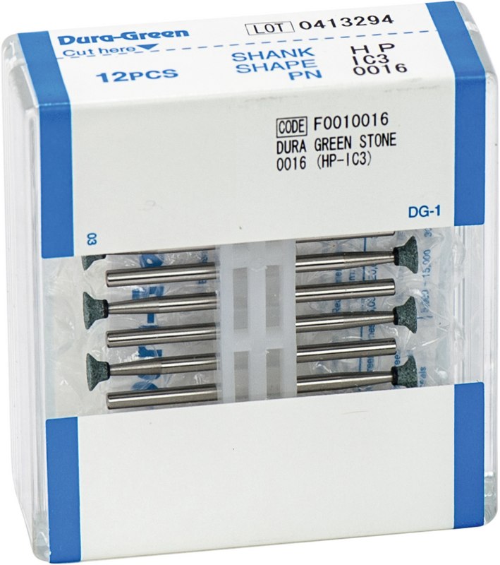Dura-Green-Steine eignen sich hervorragend zum splitterfreien Ausarbeiten von Keramik, Komposit, Edelmetall und Amalgam. Empfohlene Drehzahl 5.000 - 20.000 U/min., max. Drehzahl 30.000 U/min. / AD 3 - 5 N.